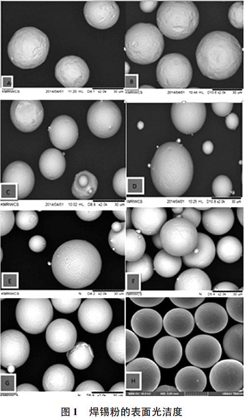 4號(20~38μm)焊錫粉是焊料市場的主流,本文選用不同形貌SnAg3.0Cu0.5的4號焊錫粉與同一種助焊劑配制成焊錫膏進行測試。將不同形貌的焊錫粉編號為A~H,焊錫粉放大2000倍的表面光潔度如圖1所示,SEM圖中從A到H焊錫粉的表面逐漸光滑。將A~H焊錫粉與同一助焊劑配制焊錫膏編號為1#~8#,選用綜合性能較好,且已投入生產(chǎn)的A500助焊劑與各種焊錫粉配制焊錫膏。配制焊錫膏的工藝參數(shù)完全相同,即助焊劑A500質(zhì)量百分比11.5%,焊錫粉質(zhì)量百分比88.5%。