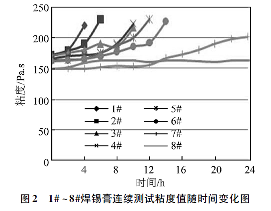 從圖2中看出,8個焊錫膏樣品的初始粘度均在150~170Pa·s之間,隨著測試時間的延長,除8#焊錫膏以外其他焊錫膏的粘度均增大。其中1#焊錫膏測試4h后砂化,2#焊錫膏測試6h后砂化,3#、4#焊錫膏測試10h后砂化,5#焊錫膏測試12h后砂化,6#焊錫膏測試14h后砂化,焊錫膏砂化后不再繼續(xù)測試。7#焊錫膏測試12h后粘度值開始增加,但增長速率較為緩慢,8#焊錫膏在24h內(nèi)粘度值很穩(wěn)定。一般來說,焊錫膏的粘度變化幅度越大,出現(xiàn)砂化時間越短,說明焊錫膏的穩(wěn)定性越差。焊錫膏通常是需要連續(xù)印刷,連續(xù)測試焊錫膏的粘度可以間接判斷焊錫膏在連續(xù)使用過程中的穩(wěn)定性。測試時間越長,粘度變化越小的焊錫膏印刷時的穩(wěn)定性越好,反之,焊錫膏印刷時的穩(wěn)定性越差。