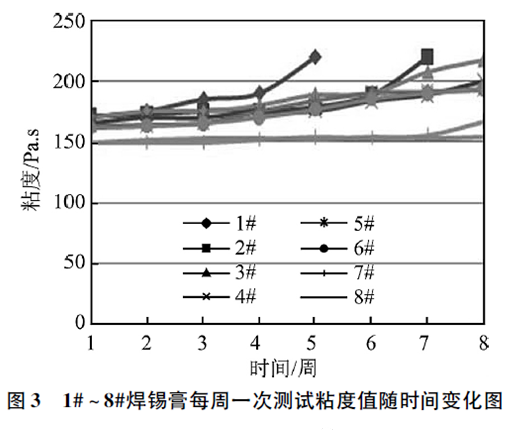 從圖3看出,1#、2#焊錫膏連續(xù)測試不到8周砂化,3#~8#焊錫膏在8周測試時間內(nèi)未砂化,但3#~6#焊錫膏粘度變化較大,粘度變化超過20%,不利于焊錫膏印刷使用。7#、8#焊錫膏粘度值穩(wěn)定,保質(zhì)期較長。